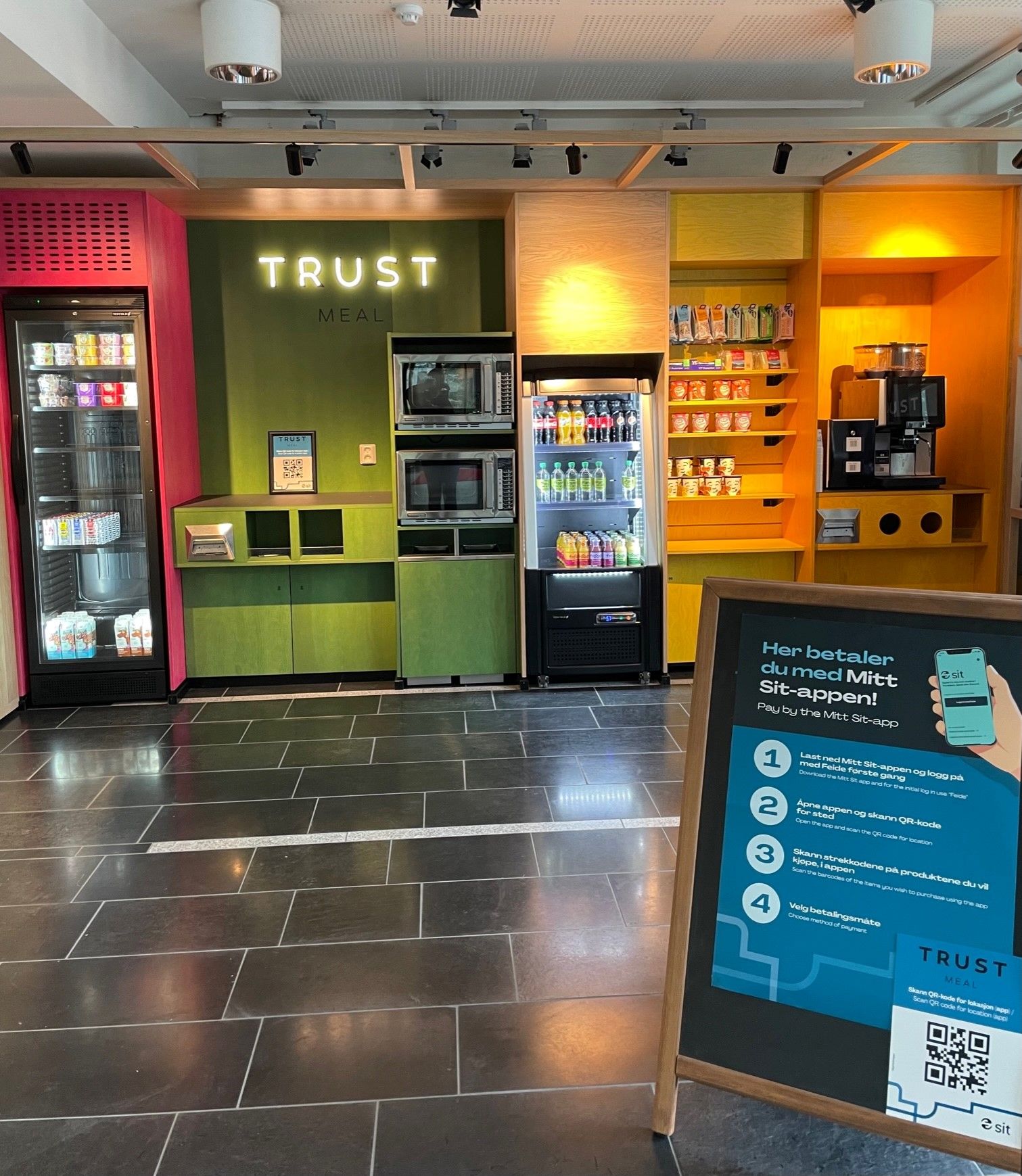 At our Trust Meals, you’ll find a simple dining option available around the clock. Trust Meal is a self-service concept, based on trust. You can use the services at any time of day and pay easily via our self-service kiosk.